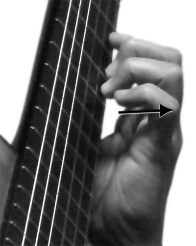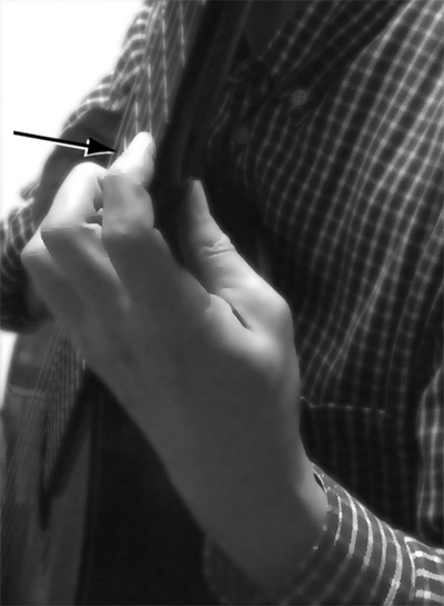 | 【図2-6】 小指は“コ”の字形に、指先を垂直に指板に降ろす。 |