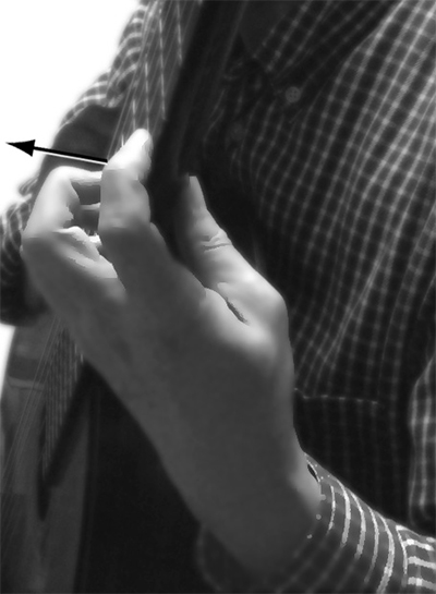 | 【図2-8】 中指と薬指も小指 と同様に“コ”の字形に、 指先を垂直に指板に降ろす。 人差し指は必要に応じて指 先を立てる。 |
