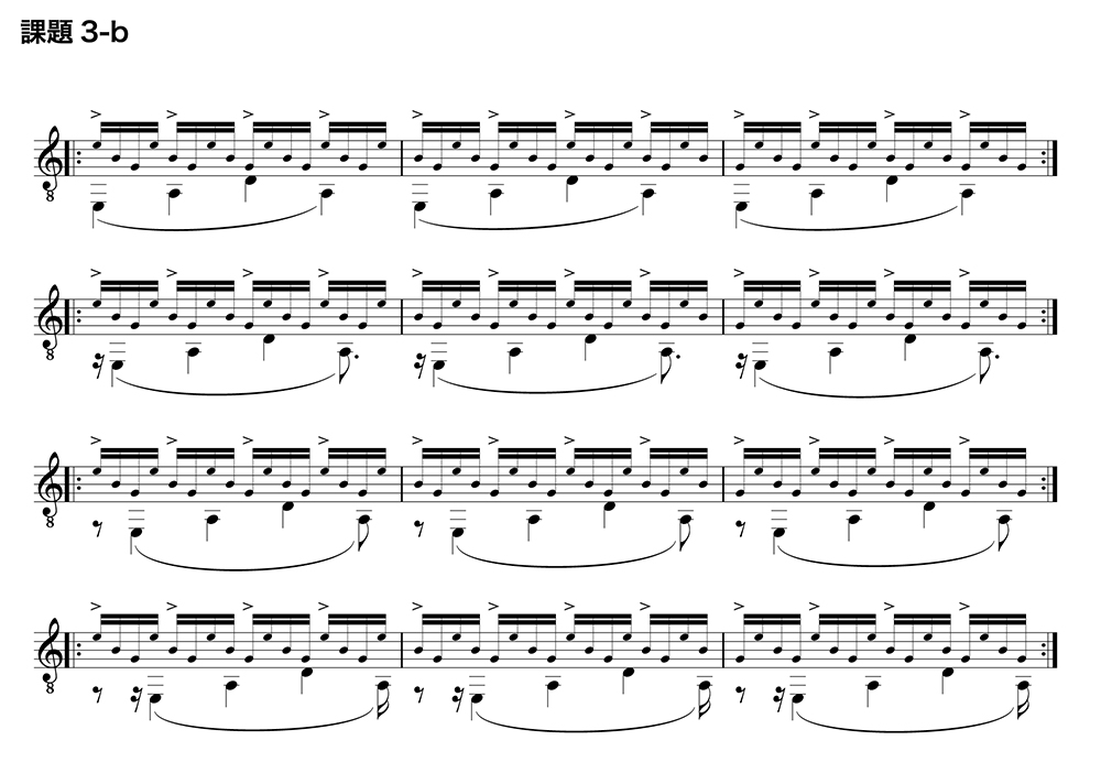 同様に【課題1-3】も復習して下さい。親指を伴っています。これの応用として以下に【課題3-b】を追加しておきます。親指の音に惑わされることなく、上声のアクセントを正確に出して下さい。つまり、指が弦を押し下げる「距離(深さ)」を正確に保つと言うことが練習のポイントです。