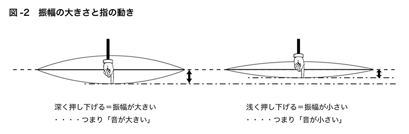 「弦の振幅」は「指が弦をどのように弾いたか」によって決定されます。もっと解りやすい例えで言うなら、弓道などで「矢を遠くに飛ばすために弓の糸をいっぱいに引く」ことと同じです。アポヤンド奏法で、指が弦をグイッと押し下げる様子を思い出して下さい。より深く押し下げれば、その押し下げた「距離(深さ)」に比例して大きな音が出ます。この原理はアル・アイレ奏法の場合も同じです。「どれくらい押し下げるか」と言う感覚をしっかり身に付けて下さい(図-2)。「強い音は強く弾くんだ!」という理解をしないようにして下さい。