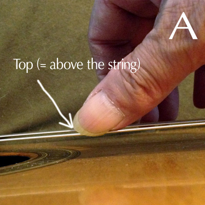大事なポイントは爪の「頂点が弦より上にある」ということです。「爪の頂点」というのは、爪はたいてい半円形の様な形になっていると思うのですが、その最も先端に当たる部分のことです。爪の弦に接する部分の面積は広い方が弾き易いので、私の場合はその「頂点」が中央ではなく右側に来るように、爪の形を作っています。そうすることによって、はるかに高い確率で「弾弦可能な状態で」親指を弦にのせる事ができます。つまり、弾き易いわけです。