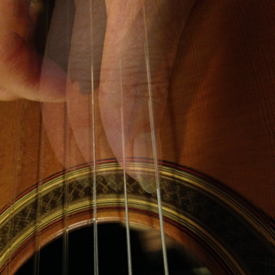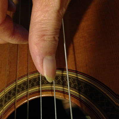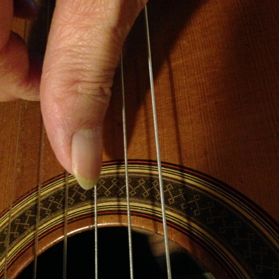 もう一度基本的な話に戻りましょう。この項の第1章で「弦に平行にタッチする」と云うことを申し上げましたが、それを別の角度から見てみましょう。6弦から4弦まで滑らかに移動できる必要があります。親指は3弦や2弦なども弾くことはしばしばありますので、出来るだけ手のひらの位置を動かさずに、親指だけでなめらかに移動できる必要があります。