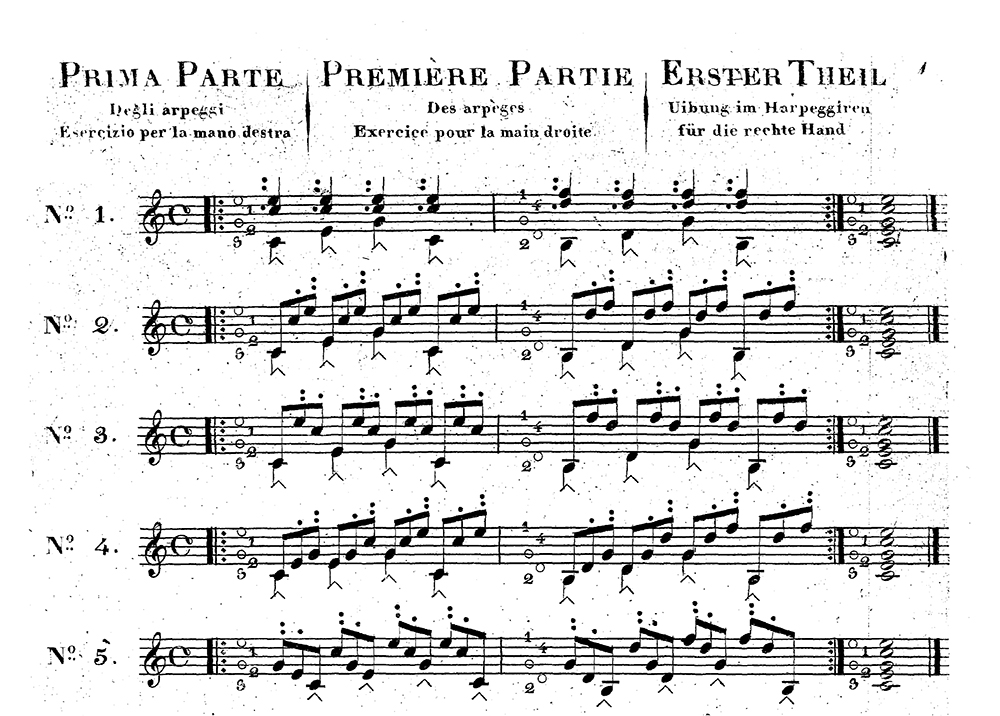「STUDIO per la CHITARRA」の第一部はこの様に始まります。当時ウィーンにある Artaria出版から出たものです。この第一部だけは現在アメリカの出版社 GSP から120例全てが、また国内では京本輔矩先生の編集された「クラシックギターの技巧方」という本に抜粋で90例が掲載されていました。申し遅れましたが、ジュリアーニはここでなんと120ものアルペジオパターンを紹介しています。