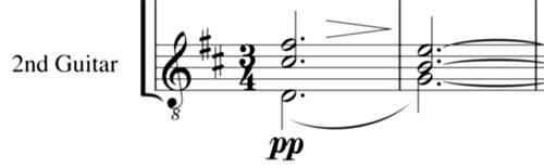 が最初の波を、そしてそれを受けて 1st guitar も波を。本来の旋律はこの波しぶきの間にまに断片的に聞こえてきます(二段目、三段目)。ですから二人の奏者は互いの音のバランスを気遣いながら、メロディーを繋いで行って下さい。四段目と五段目では波のしぶきが跳ね返り、キラキラと輝きます(ハーモニックスの音)。ハーモニックスは全てを「オクターブハーモニックス(人工的ハーモニックス