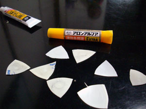 実は私も以前はよく付け爪のお世話になりました。現在は専門店でギタリスト用の付け爪セットや、また女性用の付け爪のセットもかなり安くなったので、これらを愛用している人も沢山いるようです。ここで紹介するのは私が昔からやっている方法です。