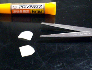 まず「ピンポン球」中央にカッターナイフで切り目を入れて、半分に割ります。半球が2つ出来上がります。それをハサミで四等分、ピースが8個出来上がります。大きさは適当で結構。(写真上から2番目)