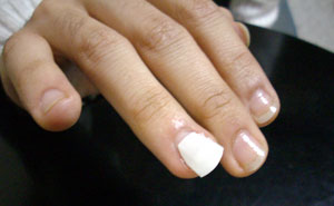 ここからの作業は、少々熟練のワザを必要とする・・・、細かな作業です。小さなハサミで人工爪(=ピンポン球)をできるだけ爪の形に合わせて切りだします。またカーブの具合も揃えて下さい。形がが納得いくものになったら、いよいよアロンアルファ(瞬間接着剤)で付けますが、その前に何度も爪の上に乗せて、どのように接着するか、どの位置に着けるか、を確認して下さい。自分の爪の側に少し、人工爪(=ピンポン球)の方には縁の方までアロンアルファを薄く塗布します。準備ができたら、一気に付けて下さい。左手でしっかり押さえて、全面がむらなく接着するようにして下さい。(写真上)