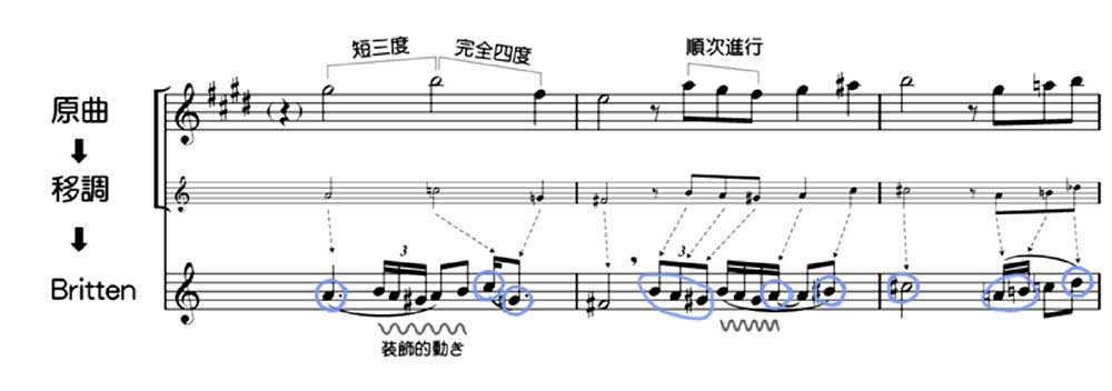 極めて自由にに書かれた即興的な音の動きに聞こえますが、実は主題の旋律を巧みに装飾したものであることが解ります。原曲の旋律を移調することによって生まれた新たな旋律は、結果的に明確な調性感を持たず、まさに彷徨えるような瞑想感を生みだしています。一方、装飾の手法は音と音との間を(音程間隔)をより細かな音で細分化し繋いでいくという、ルネサンス・バロック期にごく一般的に用いられていた手法を思わせます。それは例えばダウランドのリュート独奏曲の例、あるいはバッハの独奏楽器の為の組曲に見られる