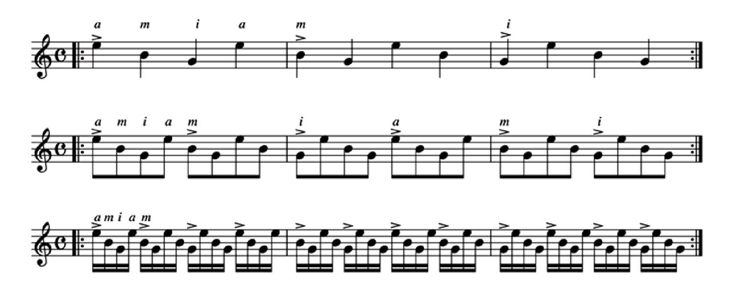 この練習は全て開放弦で、また全てアルアイレで練習して下さい。アクセント記号のついた音ははっきりと「大きな音」で。ただしその音質は決して「硬い音」ではなく「太く充実した音」で。その為にはここまで勉強してきたことを応用して下さい。特に「7.弦と指の角度」で説明したことを思いだして下さい。 テンポは「ゆっくり」と。繰り返した後は休むことなく、連続して次の段に行って下さい。そして同じテンポです。