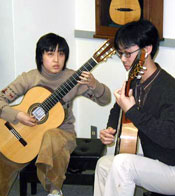 ~とても息の合った 二重奏でした。完全に暗譜をして演奏に臨む姿勢もいいですね。もっとお互いの楽器を鳴らすこと、それから二重奏では独奏の場合よりももっと自由にギターの音色を活用する(音楽的に利用する)ことが出来ますから、そういう工夫をもっとして下さい。また主題旋律のアーティキュレーションをはっきりとつけること、それによって繰り返される主題の存在感が増してきますし、音楽の発展する様子が聞き手にはもっと感じられるはずです。最初は若いご兄妹かと思っていたら、なんと(!)ご夫婦だそうです。これからもずっと素晴らしい二重曹を聞かせて下さい。(*写真4)