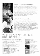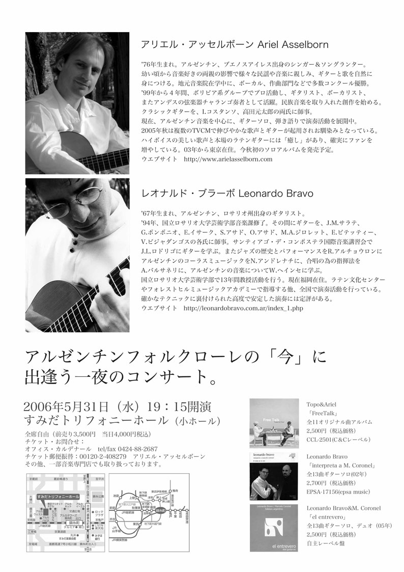 日本在住の二人のアルゼンチンギタリストが来月コンサートを行います。A.アッセルボーンさんとL.ブラーボさん。レオナルドのことは私のこのサイトでもたびたび「素晴らしいギタリスト」として紹介して参りましたので、ご存知の方も多いかと思います。アッセルボーンさんは歌も歌われるので、この二人による「アルゼンチン音楽」はまさに「本物」の味わいが期待できます。聞いてみたいですね!