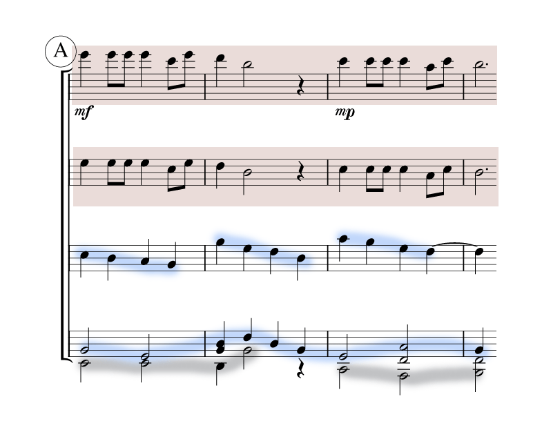 アンサンブル講座の課題曲《Air》で、四つのパートがどのような役割を担っているのか、主題の場合についてみてみましょう。