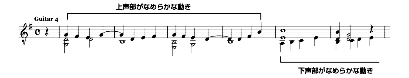 Guitar にはいくつもの仕事をしていただかなければなりません。まず「全体を支える、どっしりとした低音」そして「もうひとつの中間にある声部」を演奏するということです。他のパートは殆ど常にひとつの声部(メロディー)を演奏しますが、4th