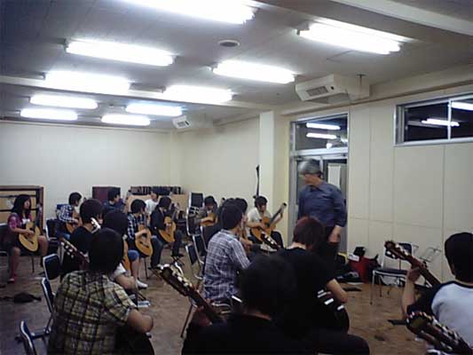 また、合奏では指揮者の役目がとても重要です。当然のことながら、指揮者へのアドバイスもしましたし、全員で「指揮法入門」もレッスンしました。この分野は、まだまだやらなければいけないことがあるようです。夜の部では昨日の復習、「基礎練習」とまたまた「爪の磨き方」。どうも、やたらと爪を長くしている学生が多く、また爪の磨き方は爪をなんのために使うかということ、つまり右手の技術と密接に関連しているので、ただ爪の磨き方というものはあり得ないのですが、そう言ったことを総合的に説明するのに苦労をしました。二日間で沢山の曲も弾きました。厳しいアドバイスもしたと思いますが、佐賀大学の皆さんが少しでも成長してくれればと思ってのことです。