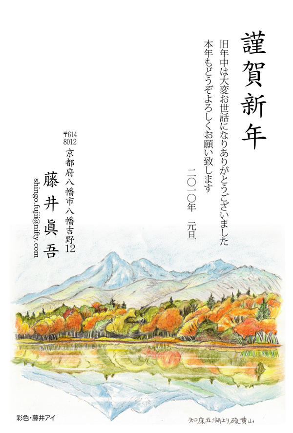 2006年に父を失い、今は一人暮らしですが、最近は「塗り絵」を楽しんでるそうで、嬉しく思っていました。毎年細君が母の年賀状作りを手伝っているのですが、「塗り絵」をして入る話を聞きつけ、それではそれを挿し絵にしたら良いだろうということで作品を送ってもらったら、想像以上に沢山の作品が送られてきて、驚きました。ぐうたらな息子は年賀状のデザインをサボって、母の作品のひとつを使わせてもらうこととした次第です。