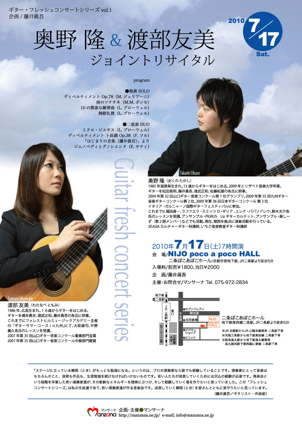 奥野隆君と渡部友美さんが二人で本格的なコンサートを開催いたします。二人はプロとしての活動を目指しながら、あるいはすでにその活動をスタートさせながら、私のところでギターを勉強している二人の若者です。私はこの演奏会に向けてつぎのような言葉を贈りました。