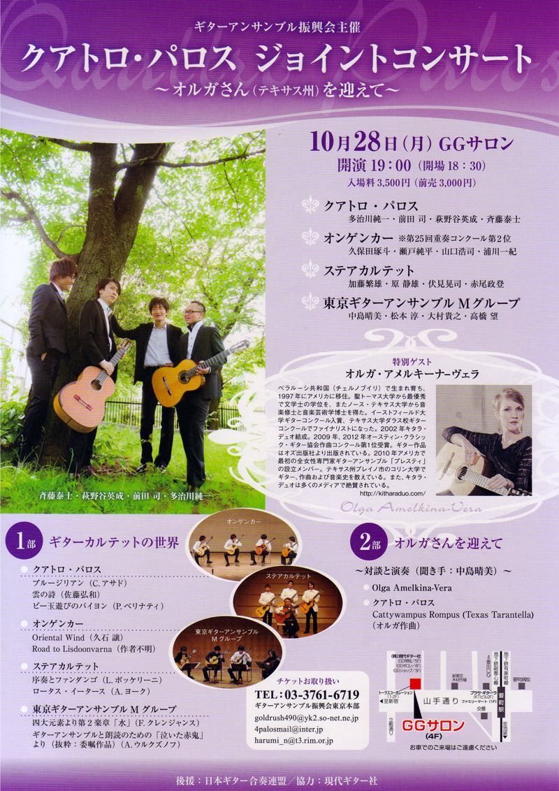 ・・・上記表題のような演奏会が10月28日(月)開催されます。クアトロ・パロスをはじめとした、東京を中心に活動しているギターのアンサンブルグループが4団体と、アメリカ(テキサス州)のギタリストで作曲家の オルガ・アメルキーナさんをゲストに迎えてのコンサートが、東京のGGサロン(現代ギター社)で開催されます。ギター四重奏の醍醐味と、そしてアメリカの若い世代の一人、オルガさんの音楽が聞きどころです。彼女は、私の作品「天使の協奏曲 Concierto de Los Angeles」が2010年にテキサス州・ダラスで演奏されたとき、そのギター・オーケストラのリーダーの一人として参加してくれていました。ギターのアンサンブルを通じて、日米の良き交流が始まることを望んでいます。クアトロ・パロスの何人かのメンバーは個々にはこれまでもレッスンなどでよく知っている人達ですが、クアトロ・パロスとしての演奏をしっかり聴かせてもらうのはこれが初めてになります。楽しみです。