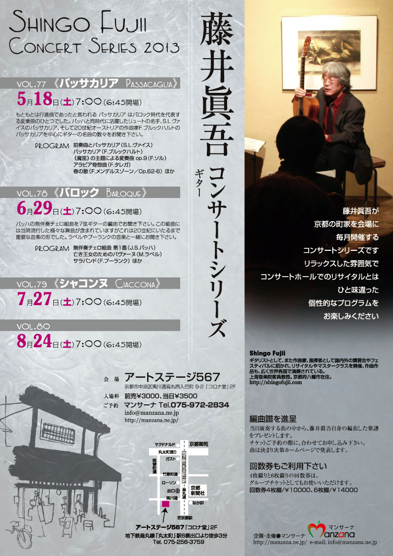 2013年のコンサートシリーズ・・・京都「アートステージ567」でのコンサートシリーズ、1月〜3月までの予定はタイトルはまだ未定ですが、以下のように決まっています。今年も、ギターの魅力、生の演奏の面白さを皆様に、少しでもお伝え出来ればと思っております。