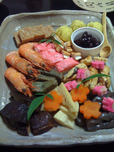 留守の間に出来上がっていた「お節料理」。手前は家内の作品。向こうに見えるのは、北海道で独り住まいとなった82歳の母の作品。今年も元気に「飯鮨」をつけてくれました |